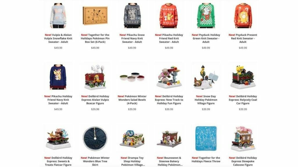 Neste ano, Pokémon conta com mais de 40 itens disponíveis para as férias, e incluem tudo, desde suéteres estilosos a ornamentos e estátuas. Os itens mais caros custam um pouco mais de US$50 (R$269,25 reais), mas em média, os itens variam entre US$30 (R$161,55 reais) e US$40 (R$215,41).