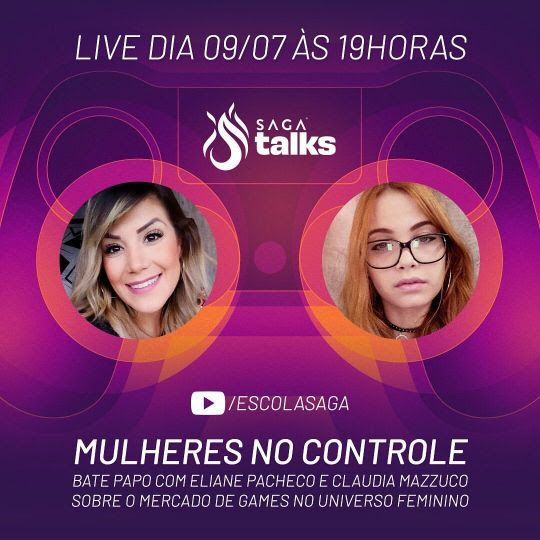 O programa será transmitido ao vivo nesta quinta-feira (9/7), às 19h, no canal do YouTube da SAGA, a rede de escolas de desenvolvimento de games, arte digital, design e efeitos visuais do Brasil, e intermediado pelo coordenador de evento da escola, Rafa Noga, que além de conversar sobre o universo gamer e a carreira das convidadas, abrirá espaço para perguntas dos espectadores.
