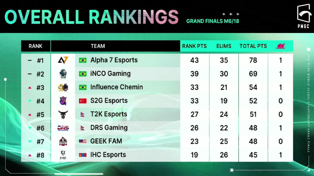 As Grandes Finais do PUBG MOBILE Global Championship 2022 (PMGC 22) começaram hoje e o Brasil está no topo da tabela com a Alpha 7 em 1º lugar, iNCO Gaming em 2º e Influence Chemin em 3º. Este ano a premiação para o primeiro colocado é de US$ 400 mil, sendo que todos os times que estão nas finais já garantem US$ 20 mil só pela participação.