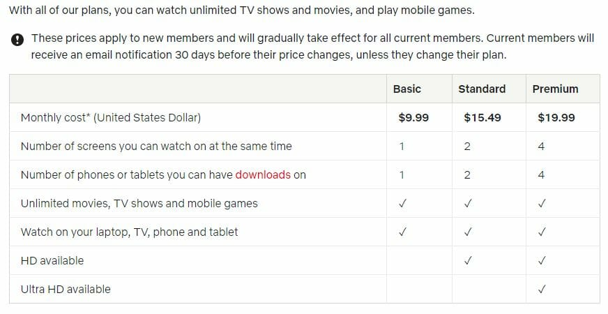 A empresa também oferece uma assinatura básica que só permite que os espectadores transmitam em definição padrão e usem uma tela por vez, por US$ 9,99 por mês. No Brasil os valores dos planos são de: Básico R$ 25,90, Padrão R$ 39,90 e Premium R$ 55,90. A diferença dos planos ficam apenas para: Imagem em HD disponível, disponível apenas para o Padrão e Premium, Imagem em Ultra HD disponível, somente para Premium e a quantidade de telas, Básico (1), Padrão (2) e Premium (4).