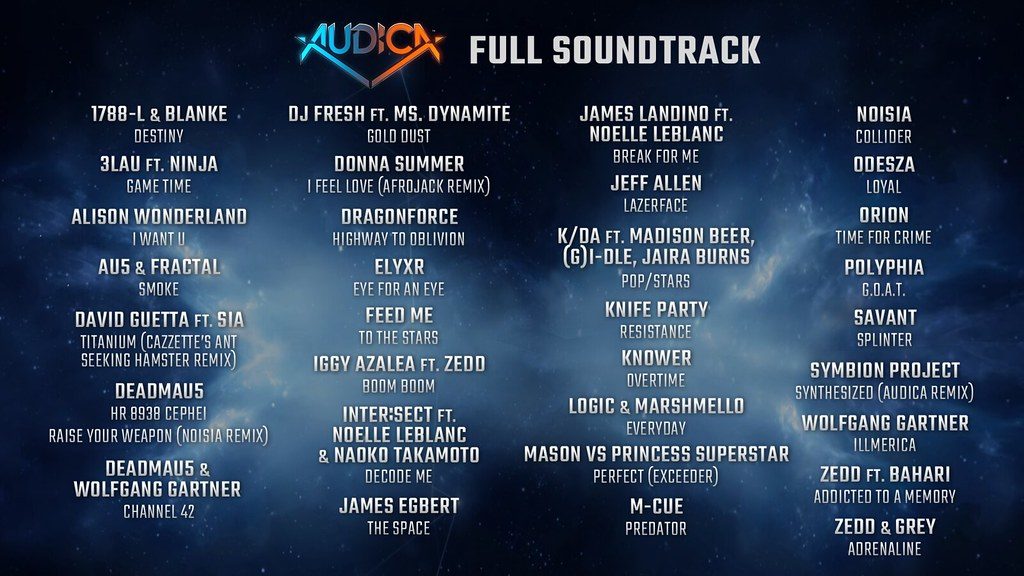 A trilha completa de Audica está cheia de músicas de artistas populares, como David Guetta, deadmau5, DragonForce, Iggy Azalea, K/DA, Logic, Marshmello, ODESZA, Zedd, e mais!
