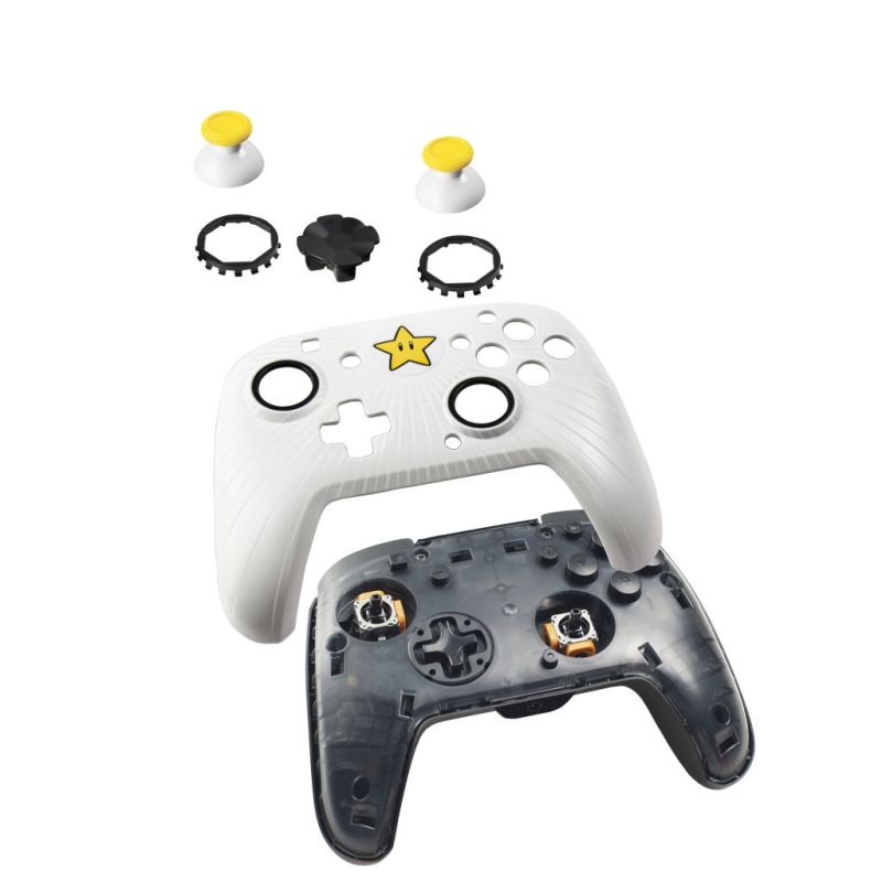 Na parte de trás, há um par de botões programáveis, que podem ser remapeados para qualquer botão no controlador. A parte da frente disponibiliza a opção de trocá-la por modelos de diferentes cores e temas