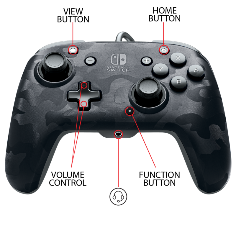 Sendo o primeiro joystick de Switch com a opção de se conectar fones de ouvido, o Faceoff Deluxe vem com basicamente o mesmo layout que o Switch Pro Controller, embora os botões + e − estejam trocados pelos botões de visualização e Home