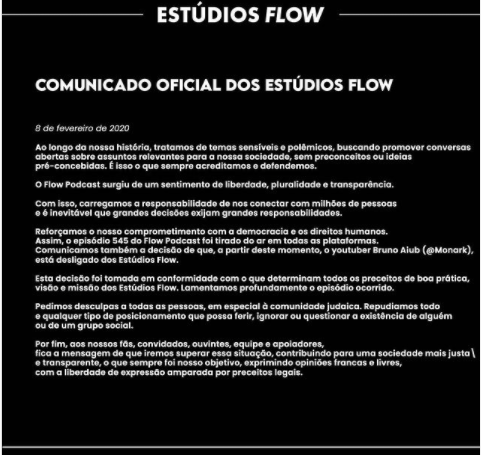 No dia 7 de fevereiro de 2022, uma declaração do apresentador Bruno “Monark” incendiou as redes sociais e causou consequências graves ao podcast “Flow Podcast”. O episódio teve participação dos deputados federais Kim Kataguiri (PODE-SP) e Tabata Amaral (PSB-SP), onde o apresentador Bruno “Monark” defendeu a existência de um Partido Nazista legalizado no Brasil em defesa de um pensamento que chamou de “Total Liberdade de Expressão”.