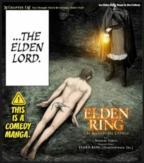 Intitulado Elden Ring: Road to the Erdtree, a história mostra um infeliz e mal equipado Tarnished e seu caminho pelas Terras Intermediárias. O mangá de paródia começa recriando a cena épica de abertura de Elden Ring, apenas para revelar um herói vestindo apenas roupas íntimas. Outras reviravoltas bem-humoradas na mitologia de Elden Ring incluem Melina castigando Torrent por “brincar”, Tarnished atacando Varre durante seu monólogo tutorial e Godrick the Grafted, apresentando seus apêndices alternativos como um caixeiro viajante.