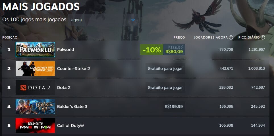 Em ordem, os mais jogados da Steam são: