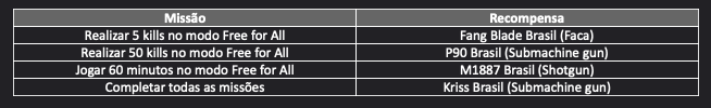 Todavia, as recompensas não param por aí. Após a aquisição das armas do arsenal Brazuca 2 nas missões do modo Step-UP, os jogadores poderão obter ainda as armas do arsenal Brasil em um novo conjunto de missões. Diferentemente da primeira semana, as missões da segunda semana serão focadas no modo Free for All. Na oportunidade, os jogadores devem fazer o maior número de kills e ter o menor número de deaths possível em uma partida com até 16 jogadores, onde todos se enfrentam.