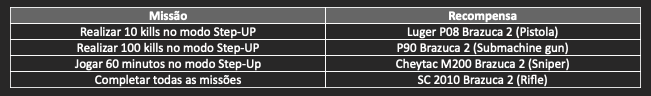O desafiador modo Step-UP está no ar e promete agitar a vida dos jogadores. Neste modo intenso e eletrizante, os jogadores recebem armas surpresas durante cada partida, aumentando os riscos e apostas a cada rodada. Além disso, por tempo limitado, arsenais temáticos do Brasil estarão presentes neste modo. No início de cada partida e também ao atingir determinadas metas de kills, os jogadores poderão usar diversas armas de 3 diferentes arsenais: Arsenal Brasil, Arsenal Brazuca e Arsenal Brazuca 2).