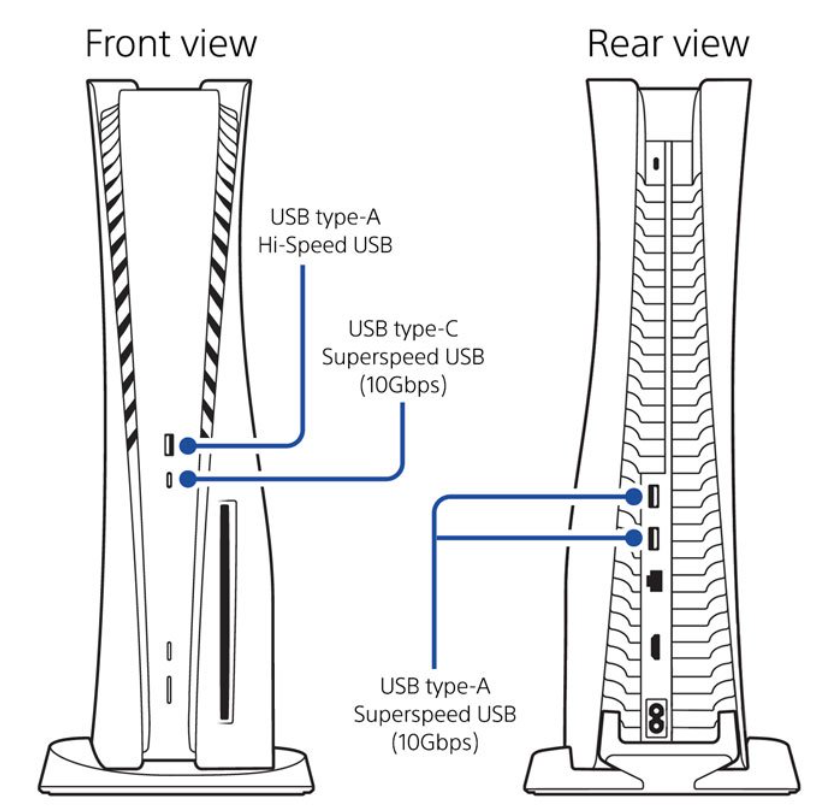 Assim como os notebooks atuais, espera-se que o PS5 também possua entradas, principalmente com velocidade e de fácil acesso. Desta forma o usuário terá 2 entradas USB frontal, sendo uma do tipo A e outra C. Já na parte traseira, o console possui 2 outras entradas USB-A, que são muito úteis para aqueles que gostam de esconder os cabos para quando não estiverem em uso.