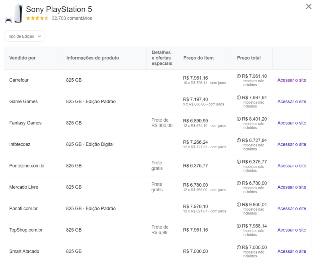 Hoje se você fizer uma busca pelo Google e até mesmo em lojas virtuais irá se assustar. O valor de 4 mil reais já é coisa do passado e os preços em vez de diminuírem só aumentarem. Algo até esperado devido a escassez do console no mercado. Hoje, 25 de maio, o valor do PS5 por exemplo no Carrefour é de R$ 7.961,16.