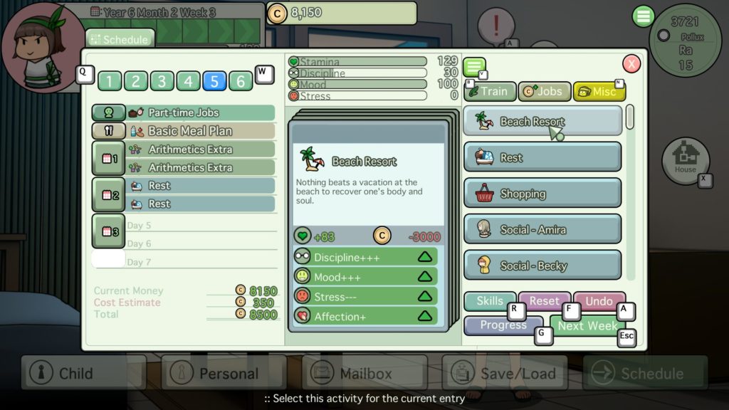 Seu lindo apartamento no ARK-3 é o novo lar de sua filha e o local em que você interage. Aqui você pode conversar com ela sobre como ela se sente ou como vai com seus amigos, personalizar suas roupas, verificar estatísticas, traços ou relacionamentos atuais, salvar o jogo e definir a programação para a próxima semana!