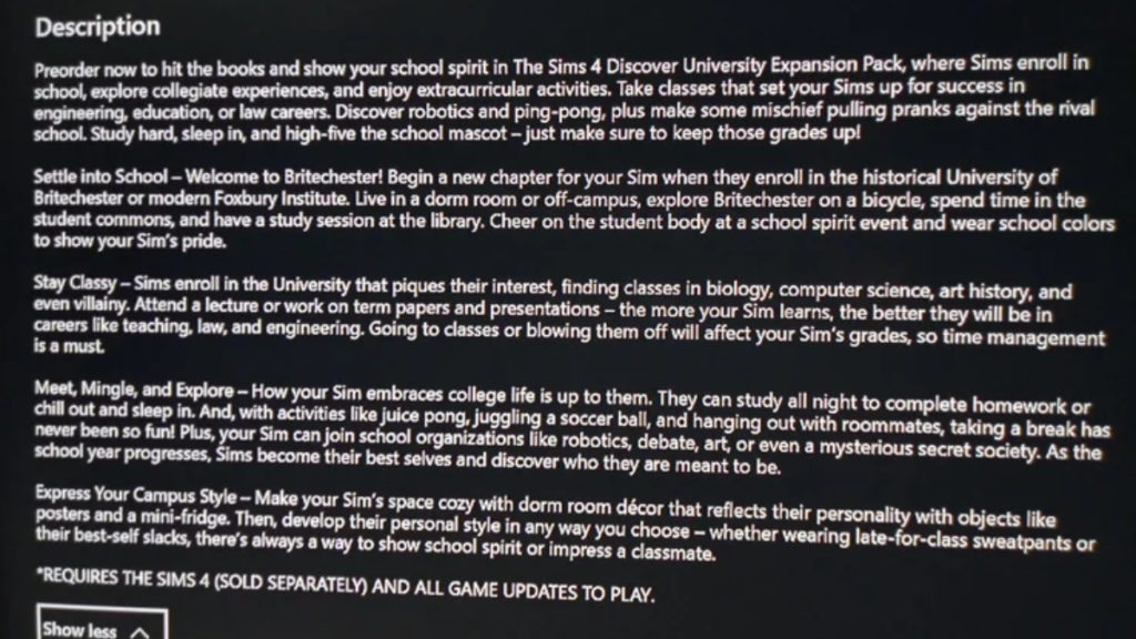 De acordo com as capturas de tela da descrição, o novo pacote apresentará um novo mundo chamado Britechester, onde os alunos podem se matricular na Universidade de Britechester ou no Instituto Foxbury, assistir a uma variedade de classes acadêmicas diferentes, interagir com os Sims através de novas oportunidades sociais e personalizar e decorar o dormitório. As capturas de tela também listam que o pacote de expansão será lançado em 17 de dezembro de 2019 para Xbox One.