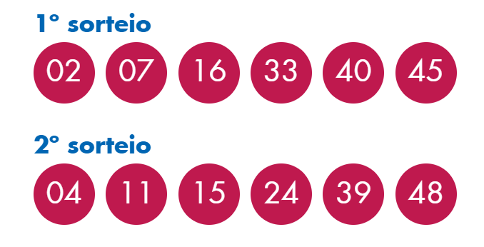 Com apenas um bilhete da Dupla Sena, você tem o dobro de chances de ganhar: são dois sorteios por concurso e ganha acertando 3, 4, 5 ou 6 números no primeiro e/ou segundo sorteios.
