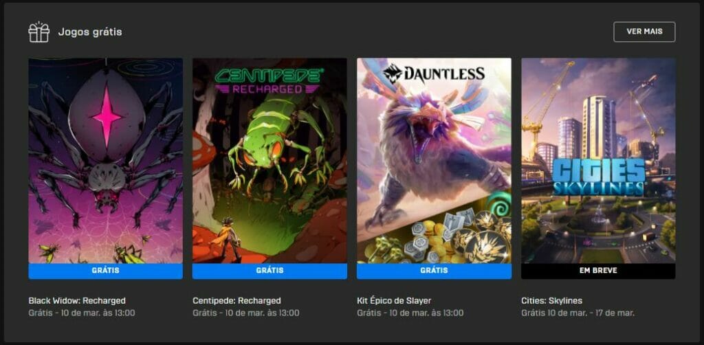 Já estão liberados os dois novos jogos gratuitos do mês de março mais um Kit Épico da Epic Games Store. Os títulos são Black Widow: Recharged e um dos clássicos da Atari e jogado a exaustão até os dias de hoje Centipede: Recharged. Já o Kit Épico é o de Dauntless. Estas são novas versões de jogos de arcade clássicos que receberam atualizações gráficas e outros recursos modernos.