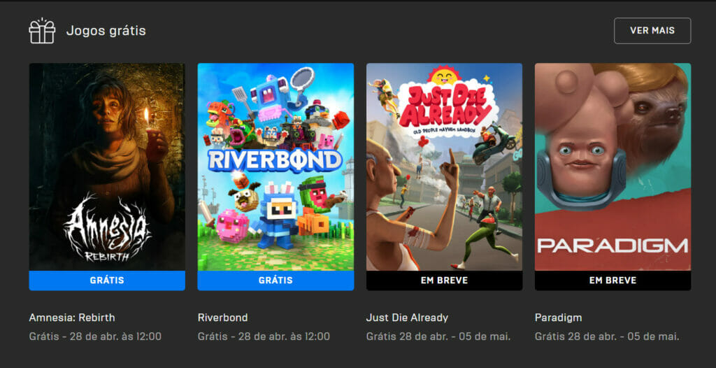 Ontem, a Epic liberou dois títulos muito bons, sendo Amnesia: Rebirth o melhor. Além dele, a empresa também disponibilizou Riverbond. Para adquirir os dois, os jogadores tem até o dia 28 de abril, quando serão trocados pelos novos títulos Just Die Already e Paradigm. Amnesia: Rebirth e Riverbond estarão gratuitos até às 12h59. A partir das 13 horas (Brasília), serão retirados.