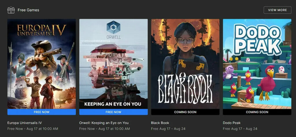 E como acontece todas as quintas-feiras, hoje (10), a Epic Games liberou dois jogos totalmente gratuitos para os jogadores de PC, sendo eles: Europa Universalis IV e Orwell: Keeping an Eye on You. Os dois títulos estarão disponíveis até o dia 17 de agosto, quando serão trocados por Black Book e Dodo Peak. Mas aí que está a pegadinha.