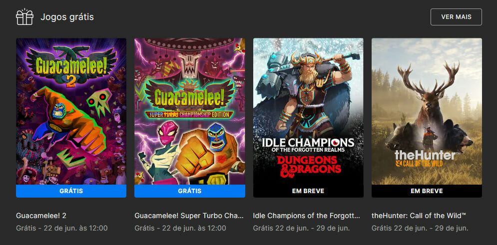Mas para que possa reivindicá-los, existe um prazo, e estes novos dois games estarão disponíveis até o dia 22 de junho, próxima quinta-feira, até às 12 horas, quando serão substituídos por Idle Champions of the Forgotten Realms e theHunter: Call of the Wild. Agora os jogos que foram disponibilizados hoje (15) são: Guacamelee! 2 e Guacamelee! Super Turbo Championship Edition.