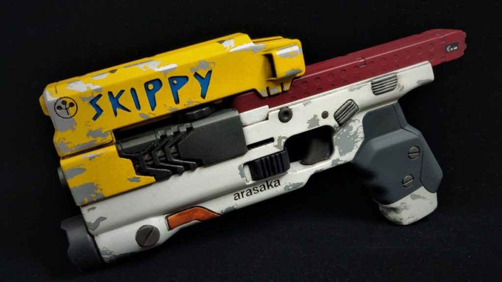 Porém, um usuário do Reddit chamado M3ntumGE foi além ao fazer uma réplica em tamanho real da pistola Skippy de Cyberpunk 2077. Skippy é considerado por muitos como uma das armas mais icônicas do título, não apenas por seu design distinto, mas também devido ao fato de que a arma pode falar ativamente com o jogador durante os segmentos de jogo.