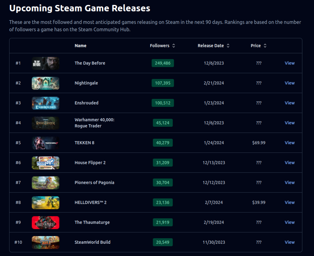 A classificação, determinada pelo número de seguidores no Steam Community Hub, revela que o jogo conta com um número impressionante de seguidores de quase 250.000 entusiastas. Este domínio é particularmente digno de nota, pois supera seus concorrentes em mais que o dobro dos seguidores de Nightingale, Enshrouded e Warhammer 40.000: Rogue Trader.