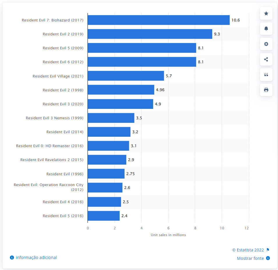 Resident Evil mais vendidos em todo o mundo em dezembro de 2021, por unidades vendidas (Publicado em fevereiro de 2022)