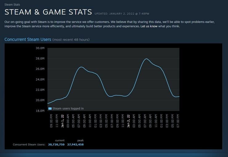 2021 foi um ano muito especial para a loja de jogos para PC, Steam, da Valve. Em 28 de novembro, o Steam quebrou seu recorde de usuários simultâneos ao acumular um pico impressionante de 27,4 milhões de usuários, com 7,8 milhões desses usuários atualmente no jogo. Não foi a primeira vez que o Steam quebrou o recorde em 2021 e parece que também não será um recorde duradouro. A Valve mais uma vez quebrou seu recorde de usuários simultâneos do Steam em 2 de janeiro de 2022, atingindo quase 28 milhões de usuários online ao mesmo tempo.