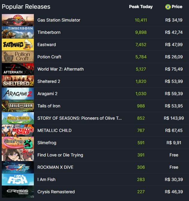 Ao entrar no site, dependendo da hora, poderá ver que o jogo também bate (Brasil) em número no Pico de Hoje (Peak Today) jogos como Crysis. Lógico que se for olhar o número total de jogadores, Deathloop possui mais de 20.000, enquanto Gas Station está com 12.000. De qualquer forma é fascinante ver um título de nicho ganhar um público tão grande, ainda mais que outros jogos de simulação – e excelentes -, foram lançados nesse ano como Lawn Mowing Simulator no mês passado.
