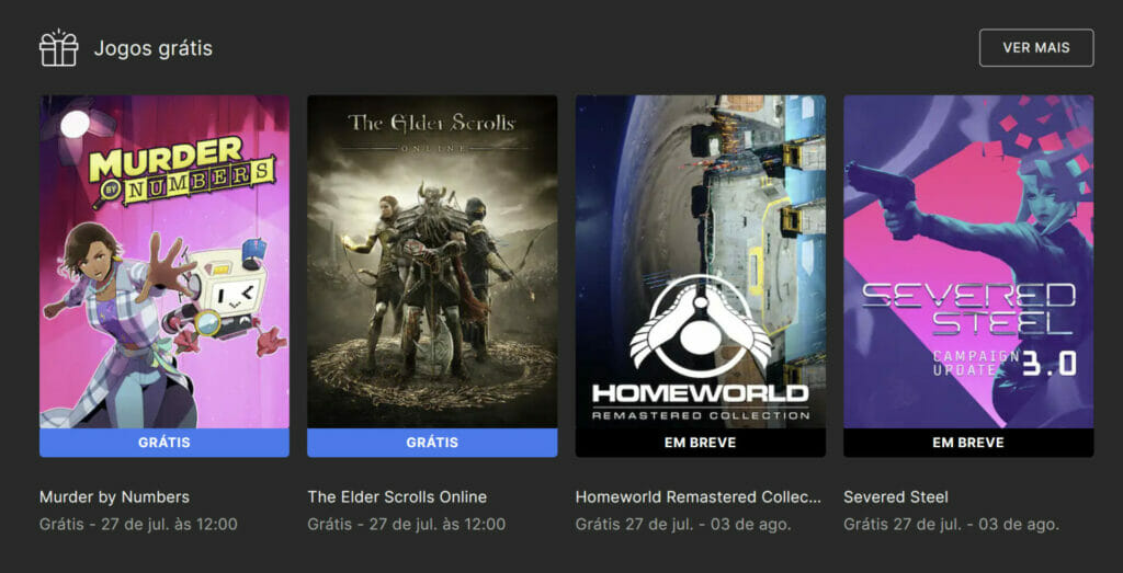 Mas para que possa reivindicá-los, existe um prazo, e este novo game estará disponível até o dia 27 de julho, próxima quinta-feira, até às 12 horas, quando será substituído por outros dois títulos: Homeworld Remastered Collection e Severed Steel. Mas hoje (20), os usuários da Epic Games Store já podem reivindicar Murder by Numbers e The Elder Scrolls Online.