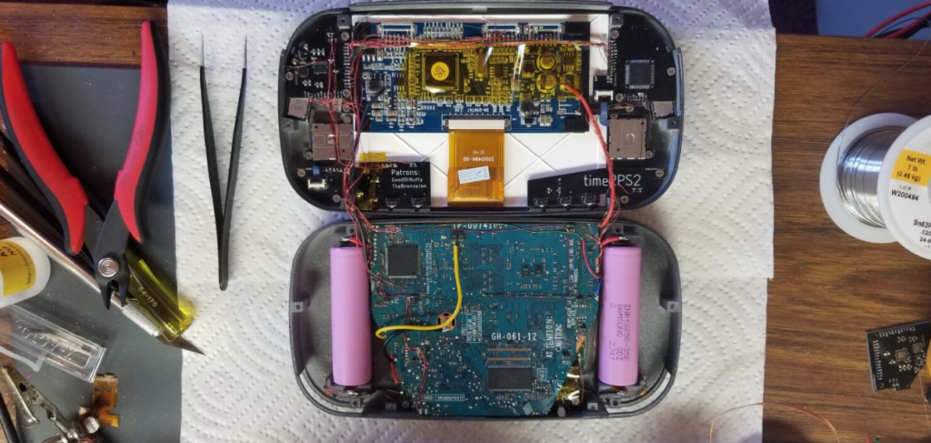 De acordo com responsável pela façanha, o aparelho usou como base uma placa-mãe de PS2, que foi delicadamente cortada e sobreposta para diminuir seu tamanho. Na sequência, Ginger desenvolveu e imprimiu uma carcaça especialmente projetada para as dimensões desejadas. Confira essa parte do projeto abaixo: