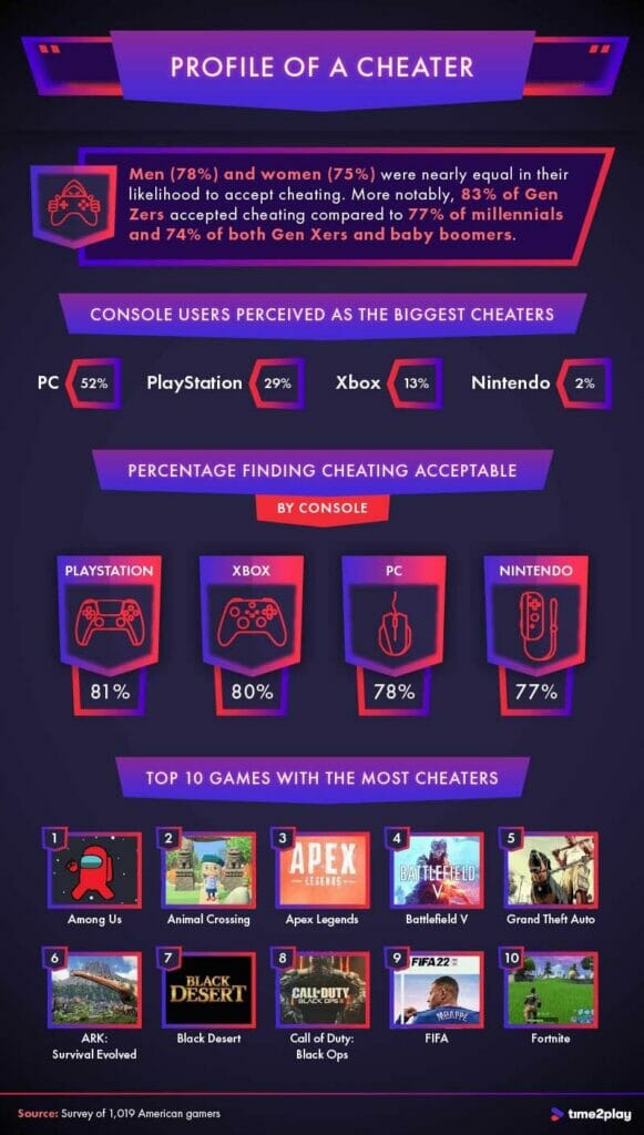Uma pesquisa com 1.000 jogadores nos EUA realizada pela Time2Play concluiu que os jogadores de PlayStation e a Geração Z são os dois grupos mais propensos a trapacear enquanto jogam videogames. Notavelmente, os jogadores de PC foram mais percebidos como trapaceiros nos jogos, apesar dos jogadores de PlayStation confessarem trapacear com mais frequência. Não houve diferença significativa entre homens e mulheres que consideraram a trapaça em jogos aceitável, com 78% dos homens concordando com a prática em comparação com 75% das mulheres.