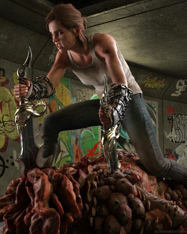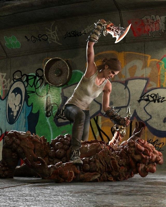 Além disso, com um salto no tempo para The Last of Us 2, DoomsdayDave retrata o que poderia ter acontecido com a raiva de Ellie se Kratos tivesse sido sua figura paterna em vez de Joel. A renderização de DoomsdayDave apresenta Ellie em um corredor repleto de grafites enquanto ela empunha a Blades of Chaos de Kratos e supera um bloater sozinha. Se eventos semelhantes a The Last of Us 2 ocorreram como contexto para essas renderizações, DoomsdayDave demonstra que Ellie se tornaria como Kratos e seria tomada por uma fúria fervente.
