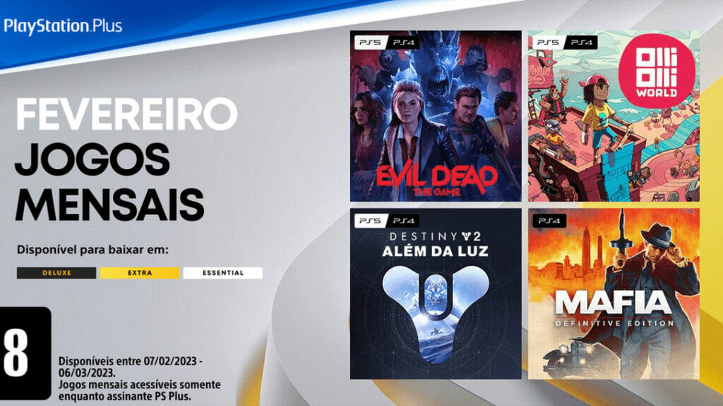 Os assinantes do PlayStation Plus podem jogar Evil Dead: The Game, OlliOlli World, Destiny 2: Beyond Light e Mafia: The Definitive Edition a partir de 7 de fevereiro. os outros títulos da linha oferecem uma edição completa do PS5. Os usuários devem observar que Beyond Light é a terceira grande expansão para Destiny 2, e os fãs terão que baixar o jogo base para jogá-lo. Destiny 2: Beyond Light é provavelmente o maior jogo da lista, mas a linha geral oferece uma boa variedade de títulos.