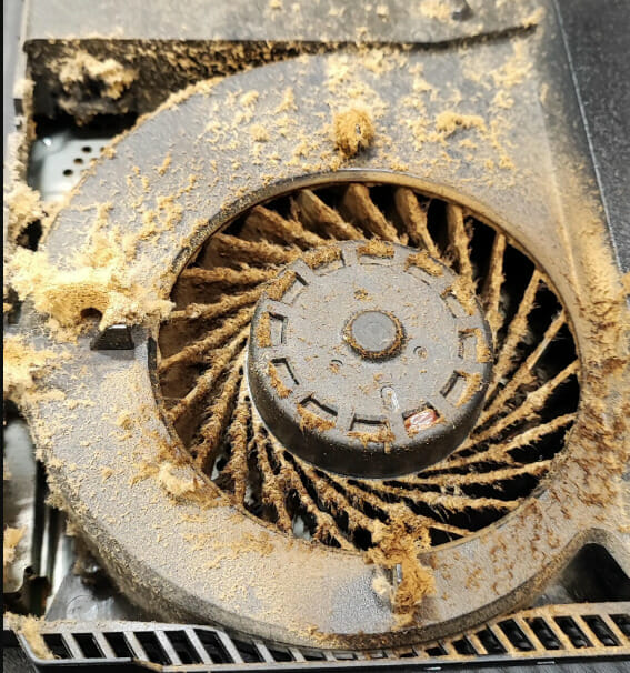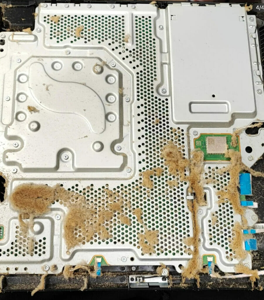 As imagens mostram que o ventilador, as aberturas e até alguns dos componentes internos estão cobertos de poeira e sujeira marrom-alaranjada que parecem grudadas em alguns lugares. De acordo com Polak5677, não exigia muito mais para limpar do que um console de jogos sujo comum, mas o sistema tinha um forte cheiro de cigarro, indicando de onde a sujeira provavelmente se originou.