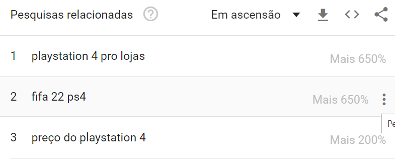 O interesse disparou para mais de 650% nas últimas quatro horas, e os dois assuntos que vem depois também tem link com o veterano: ‘FIFA 22 PS4’, também com um interesse gritante de mais de 650% e, por fim, ‘Preço do Playstation 4’.