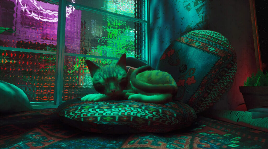 Uma das interações mais notáveis vem das várias áreas onde o jogador pode sentar e descansar, em um certo ponto esperando em um desses locais por pelo menos uma hora no caminho para obter o troféu Stray’s Platinum. Embora esses locais de descanso já possam ser adoráveis e pacíficos, o Haptic Feedback no DualSense permite que o jogador sinta e ouça o gato ronronando enquanto dorme, soando e parecendo um ronco.