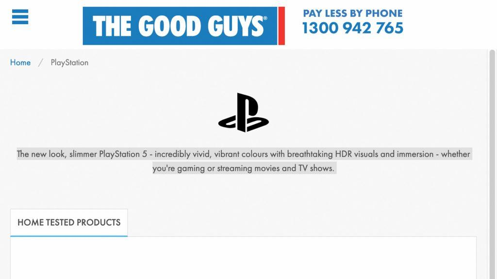 O site australiano The Good Guys cometeu um pequeno erro ao alterar uma página de espera para mencionar um potencial PS5 Slim. Não há produtos listados, mas o que é potencialmente um pedaço de texto personalizado é rotulado na parte superior. “O novo visual, PlayStation 5 mais fino – cores incrivelmente vivas e vibrantes com visuais HDR de tirar o fôlego e imersão – seja jogando ou transmitindo filmes e programas de TV.”