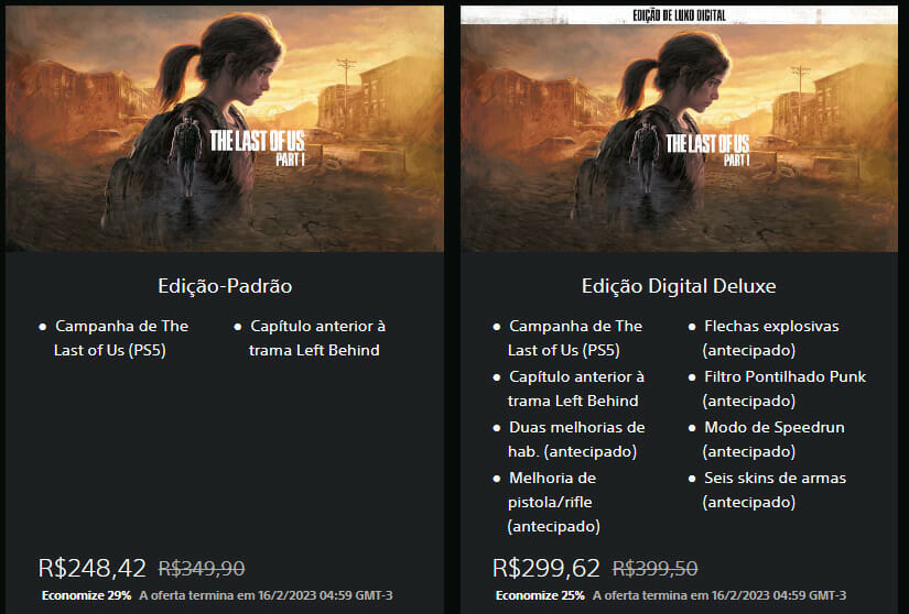 A Edição Digital Deluxe e a Padrão de The Last of Us estão com até 29% de desconto. As duas edições para o PlayStation 5 tem esse valor promocional por tempo limitado, ou seja, somente até o dia 16 de fevereiro de 2023. Após isso, os jogos voltam para o seu valor normal. Sem dúvida é uma ótima oportunidade para aqueles que ainda não possuem o jogo.