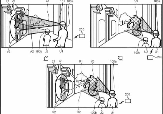 Esses jogadores provavelmente experimentam feedback tátil direcional através do PS VR2 com base em patentes anteriores de VR da Sony. Os diagramas da patente mostram dois jogadores observando um inimigo enquanto ele passa por sua linha de visão no fone de ouvido VR.