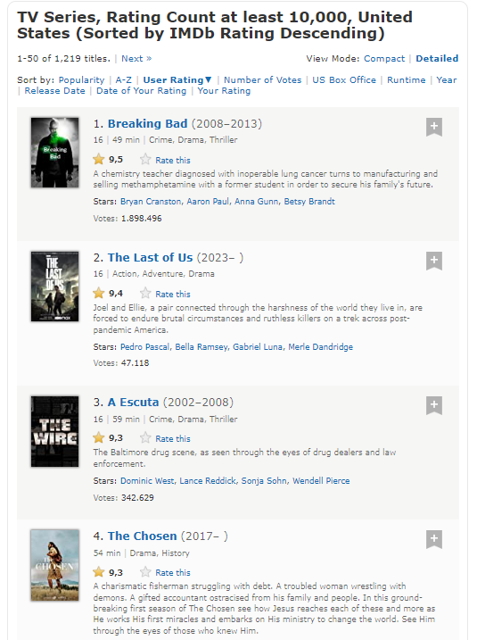 A principal ressalva dessa situação é que esse ranking é baseado apenas em um mínimo de 10.000 votos. Ao expandir o número de votos de pontuação do usuário para 100.000 ou mais, Breaking Bad, The Wire e Avatar: The Last Airbender são considerados os melhores programas de TV de todos os tempos pelos fãs, enquanto The Last of Us ainda não foi colocado.