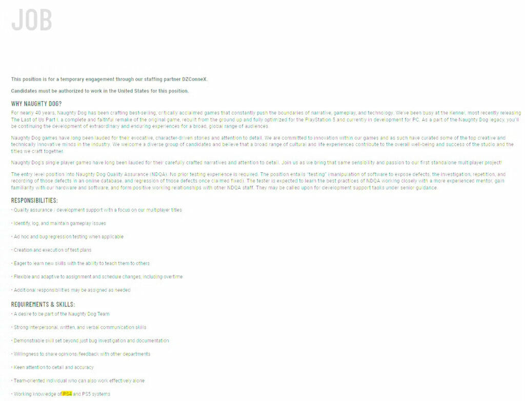 A lista de empregos mais recente da empresa para um “Testador de garantia de qualidade multijogador associado” indica que a Naughty Dog está expandindo sua equipe de garantia de qualidade. Curiosamente, entre os requisitos e habilidades, a vaga especifica um “conhecimento prático dos sistemas PS4 e PS5″.