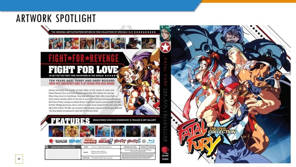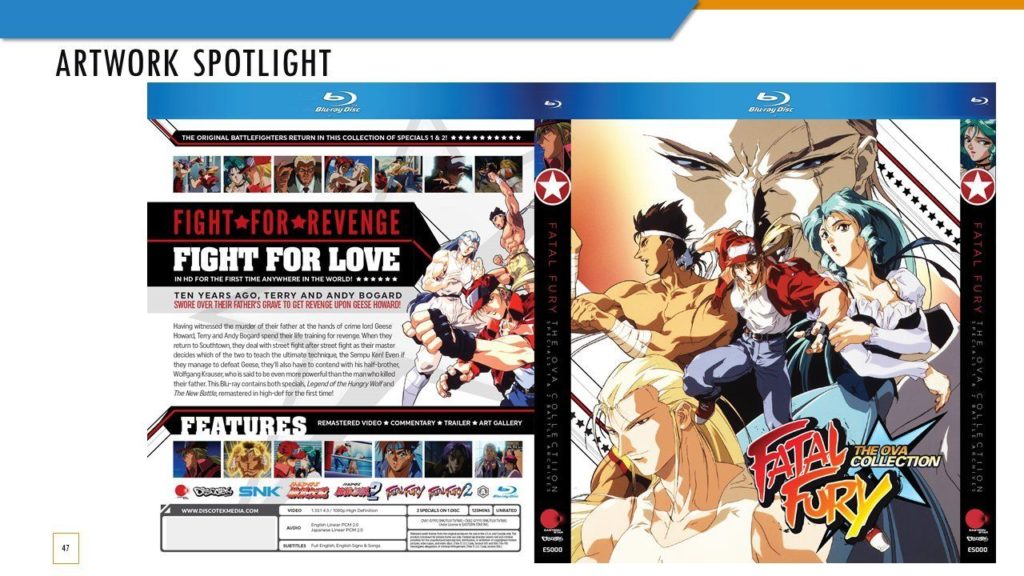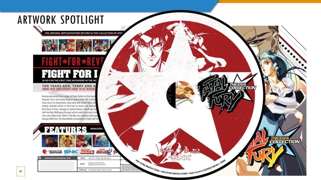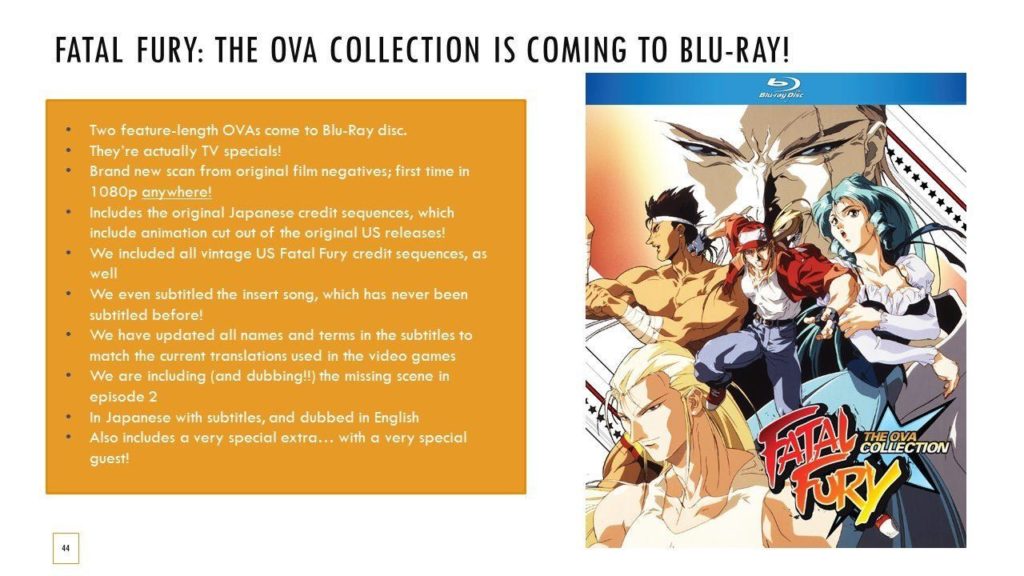 O Fatal Fury OVA Blu-ray terá legendas atualizadas, porém, todos os nomes dos personagens serão precisos, e as sequências de créditos originais japonesas e americanas estarão presentes. Além disso, Fatal Fury 2 terá uma cena restaurada, traduzida e dublada. E sobre a resolução de imagem, 1080p só foi possível devido a uma “nova digitalização dos negativos do filme original”.
