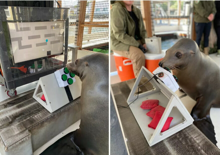 Até agora, três leões-marinhos da Califórnia foram treinados para usar o sistema, controlando o cursor com o focinho através de um simples labirinto virtual. “Quando ele cruza a linha de chegada, nós torcemos e seu treinador o recompensa com arenque“, disse Maison Piedfort, do Centro de Guerra de Informações Navais do Pacífico, em um comunicado descrevendo o trabalho.