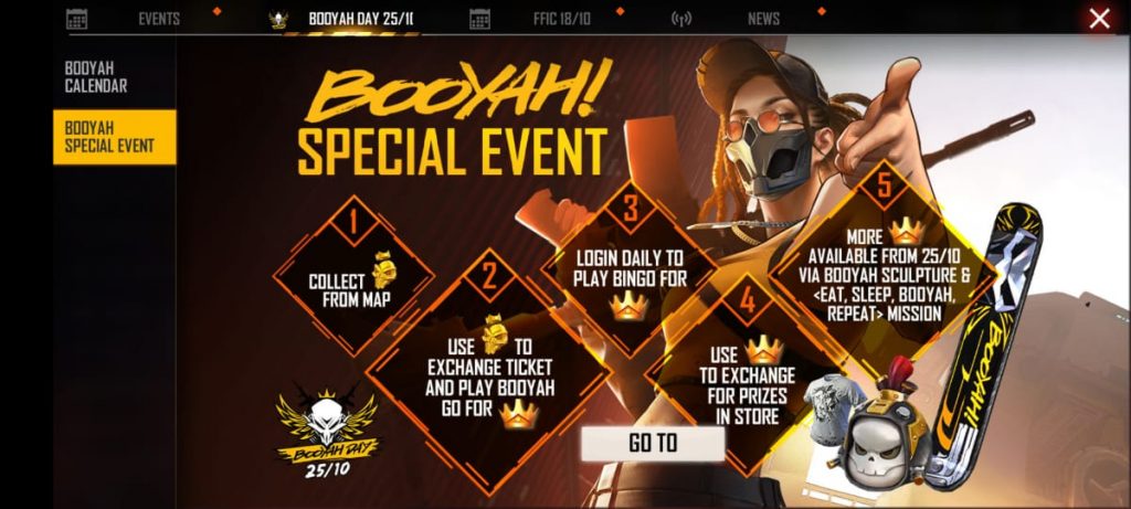 Outra maneira simples e oficial, são os eventos Booyah! que são realizados regularmente. Feitos pela Garena para conteúdo e vídeos de jogos, os jogadores geralmente precisam fazer upload de clipes de games para participar dos eventos. Exemplo: um “creative crafters” está ocorrendo e os diamentes são os prêmios. O jogador só deve compartilhar vídeos de si fazendo algo que é pedido no desafio e pronto.