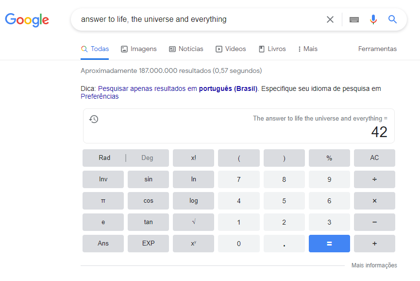 Caso seja um nerd supremo, já sabe a resposta: 42. Se não entendeu, bem, digite answer to life, the universe and everything ou também em português a resposta para a vida, o universo e tudo mais, que a resposta será 42. Por que? Os leitores do livro O Guia do Mochileiro das Galáxias escrito por Douglas Adams sabem o motivo. E qua é? Não busque no Google, compre o livro e se aventure, pois só saber o número não adianta nada.