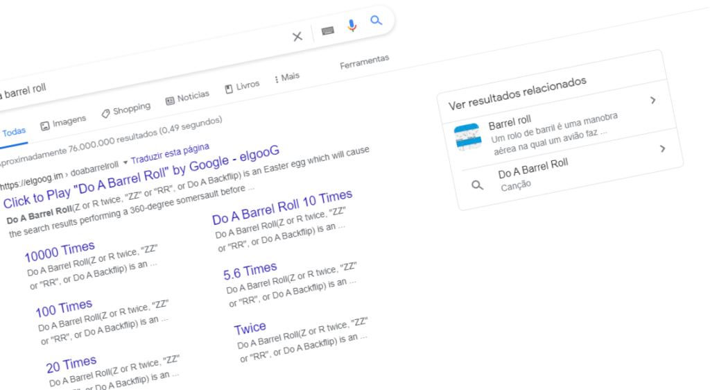 Este é uma homenagem, pelo menos no nome, para o Star Fox 64! Ao digitar z or r twice ou Do A Barrell Roll, seu navegador irá dar uma volta de 360º. Cuidado para não ficar tonto! A referência ao game é esta: z or r twice é o comando para realizar ações no console, enquanto Do A Barrell Roll e o movimento que nosso herói faz quando pilota sua nave para fugir dos inimigos. Muita gente digita os códigos de easter egg, mas nem sabia o motivo. Agora você pode compartilhar e dizer que viu aqui no Observatório de Games.