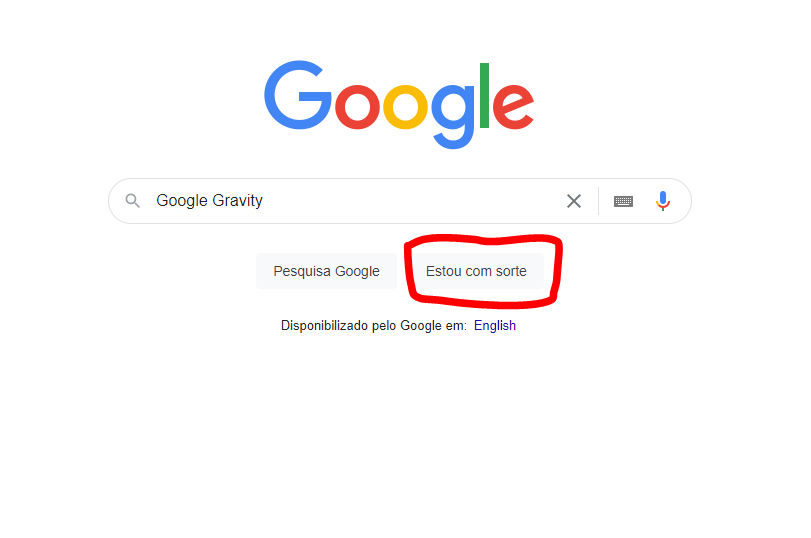 Ao entrar na página do Google, escreva Google Gravity e clique em Estou com Sorte.