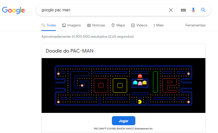 Para os fãs da antiga aí vai um código bacana! Digite Google Pac Man e se prepare para jogar o “come come” no logo do Google! Este sim é um easter egg bacana de se fazer!