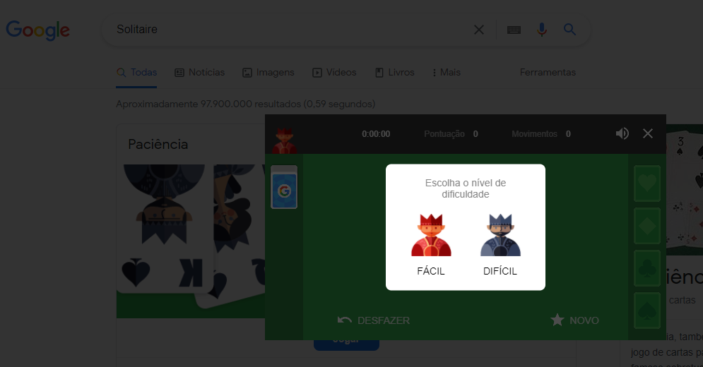 O bom e velho jogo de baralho que se tornou famoso graças ao Windows. Com certeza muitas pessoas passaram horas e mais horas na frente do Paciência enquanto deveriam estar trabalhando. E se o chefe ou outra pessoa chegasse perto, apertavam o Alt+Tab para voltar ao que deveriam estar fazendo. Pois bem, para jogar um dos mais famosos jogos, é so digitar Solitaire e pronto! Para começar é só escolher o nível de dificuldade e caso faça algum movimento errado, é só clicar em Desfazer.