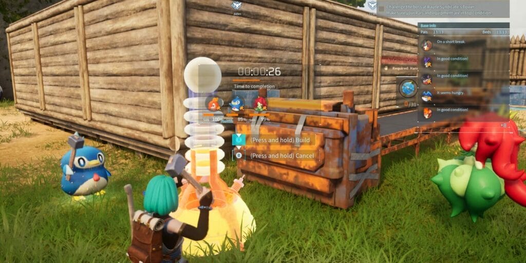 No acampamento, os jogadores podem construir uma grande variedade de estruturas, desde uma casa onde podem dormir até recipientes de armazenamento para guardar materiais ou bancadas de trabalho para artesanato. Cada Pal no jogo possui um conjunto aleatório de habilidades nas quais são bons. Por exemplo, um dos melhores materiais nas primeiras horas do Palworld é o minério.