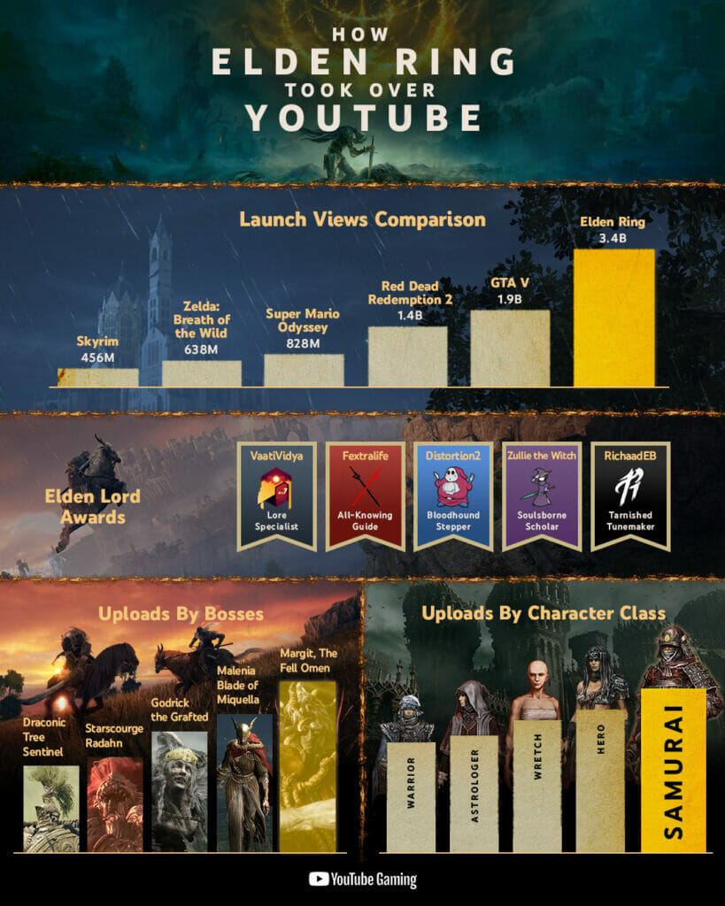 Considerando o sucesso que Grand Theft Auto 5 teve no lançamento e ainda desfruta até hoje, isso é uma prova real de quão grande é o negócio de Elden Ring. O artigo do IGN inclui algumas outras informações interessantes sobre a presença de Elden Ring no YouTube. De acordo com as estatísticas do YouTube Gaming, as classes de personagens do Elden Ring com mais uploads de vídeo são: Samurai, Hero, Wretch, Astrologer e Warrior, nessa ordem.