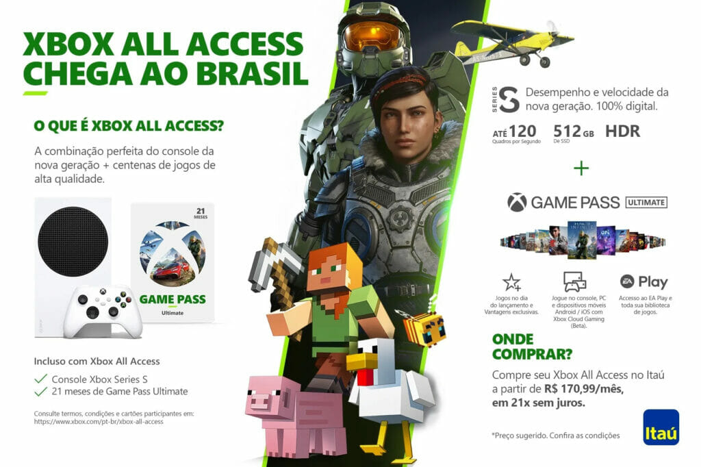 Xbox e Itaú Unibanco anunciam a chegada ao Brasil do programa Xbox All Access, exclusivo para clientes do banco. Com o Xbox All Access, os consumidores terão acesso ao Xbox Series S e à praticidade de uma assinatura de 21 meses do Game Pass Ultimate – com centenas de jogos de alta qualidade e títulos Xbox Game Studios disponíveis no dia do lançamento – por um valor sugerido de R$ 170,99 mensais. A contratação pode ser feita nos apps Itaú, Itaú Personnalité ou Itaú Cartões, e está disponível para correntistas e cartonistas do banco.